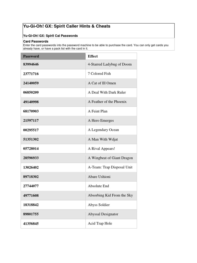 Plus great forums game help and a special question and answer system. 78 rows Enter one of the following passwords at the Password Machine to unlock the corresponding card. 742 rows Yu-Gi-Oh.